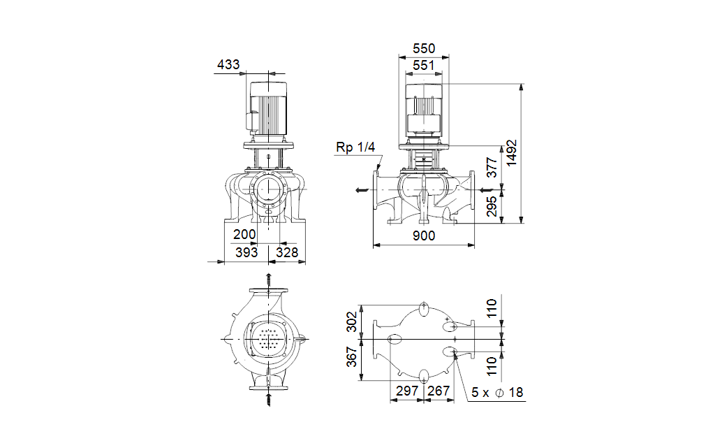 Призначення: Одноступінчаті, одинарні вертикальні відцентрові насоси Grundfos TP типу «ін-лайн» з усмоктувальним і випускними патрубками на одній лінії. Насос має конструкцію вилучення зверху, тобто головну частину (електродвигун, голову насоса і робоче колесо) можна демонтувати для обслуговування чи ремонту в той час, як корпус насоса залишається на трубопроводі. Насос оснащений незбалансованим сильфонным ущільненням. Приєднання до трубопроводу за допомогою фланців. Насос оснащений вентилятором охолодження асинхронного двигуна.