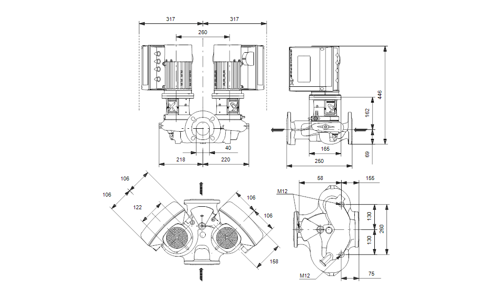 Призначення: Одноступінчаті, здвоєні насоси Grundfos TPE2 D з усмоктувальним і випускними патрубками на одній лінії, що використовуються в різних областях застосування. Здвоєний вертикальний відцентровий насос типу «ін-лайн» з вбудованим частотним перетворювачем, спроектований з двома паралельними головними частинами. Насос має конструкцію вилучення зверху, тобто головну частину (електродвигун, голову насоса і робоче колесо) можна демонтувати для обслуговування чи ремонту в той час, як корпус насоса залишається на трубопроводі. Кожна насосна частина оснащена синхронним двигуном на постійних магнітах з повітряним охолодженням однакового розміру. Електродвигун включає частотний перетворювач і ПІ-регулятор в клемній коробці. Це забезпечує постійне плавне регулювання частоти обертання електродвигуна, а також можливість коригування робочих характеристик у відповідності з заданими вимогами.