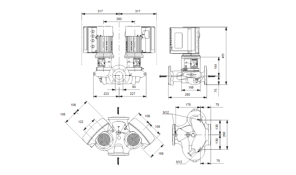 Призначення: Одноступінчаті, здвоєні насоси Grundfos TPE2 D  з усмоктувальним і випускними патрубками на одній лінії, що використовуються в різних областях застосування. Здвоєний вертикальний відцентровий насос типу «ін-лайн» з вбудованим частотним перетворювачем, спроектований з двома паралельними головними частинами. Насос має конструкцію вилучення зверху, тобто головну частину (електродвигун, голову насоса і робоче колесо) можна демонтувати для обслуговування чи ремонту в той час, як корпус насоса залишається на трубопроводі. Кожна насосна частина оснащена синхронним двигуном на постійних магнітах з повітряним охолодженням однакового розміру. Електродвигун включає частотний перетворювач і ПІ-регулятор в клемній коробці. Це забезпечує постійне плавне регулювання частоти обертання електродвигуна, а також можливість коригування робочих характеристик у відповідності з заданими вимогами.