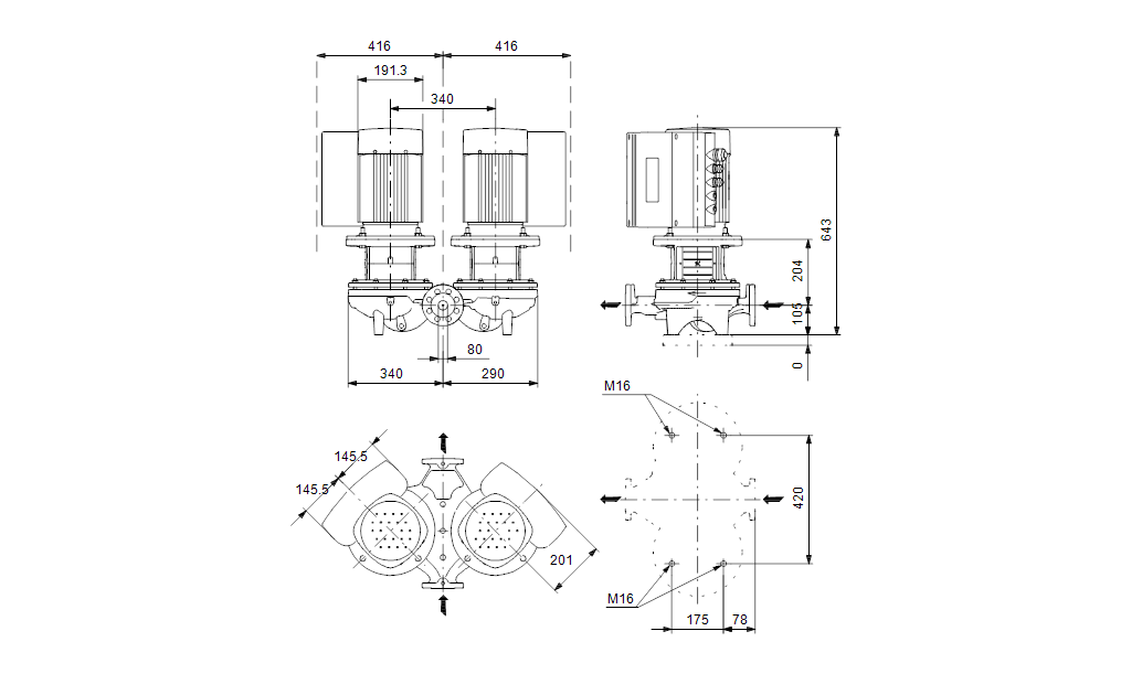 Призначення: Одноступінчаті, здвоєні насоси Grundfos TPED з усмоктувальним і випускними патрубками на одній лінії, що використовуються в різних областях застосування. Здвоєний вертикальний відцентровий насос типу «ін-лайн» з вбудованим частотним перетворювачем і датчиком перепаду тиску, спроектований з двома паралельними головними частинами. Насос має конструкцію вилучення зверху, тобто головну частину (електродвигун, голову насоса і робоче колесо) можна демонтувати для обслуговування чи ремонту в той час, як корпус насоса залишається на трубопроводі. Кожна насосна частина оснащена синхронним двигуном на постійних магнітах з повітряним охолодженням однакового розміру. Електродвигун включає частотний перетворювач і ПІ-регулятор в клемній коробці. Це забезпечує постійне плавне регулювання частоти обертання електродвигуна, а також можливість коригування робочих характеристик у відповідності з заданими вимогами. Насос оснащений датчиком перепаду тиску.
