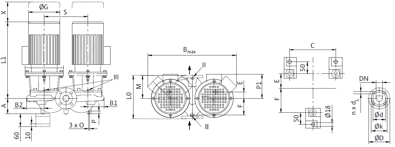 Wilo-CronoTwin-DL – Здвоєний насос з сухим ротором у виконанні Inline з фланцевим з'єднанням. Два електродвигуна на одній насосної частини дозволяють працювати в алгоритмі робочий – резервний, робочий-піковий, коли додаткова щабель підключається при нестачі однієї. При виході з ладу одного електродвигуна з різних причин, робота триває на другому, поки перший знаходиться на ремонті.