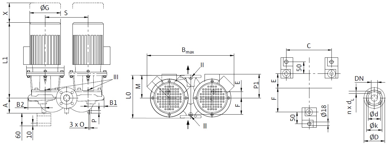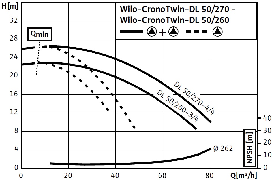 Wilo-CronoTwin-DL – Здвоєний насос з сухим ротором у виконанні Inline з фланцевим з'єднанням. Два електродвигуна на одній насосної частини дозволяють працювати в алгоритмі робочий – резервний, робочий-піковий, коли додаткова щабель підключається при нестачі однієї. При виході з ладу одного електродвигуна з різних причин, робота триває на другому, поки перший знаходиться на ремонті.