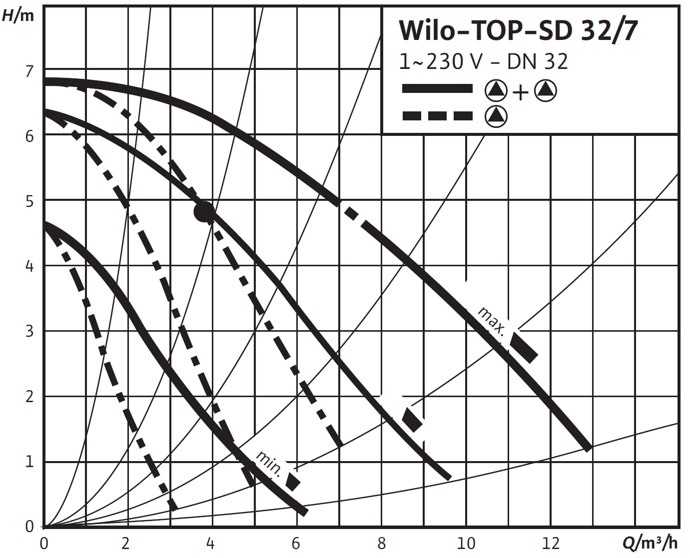 Wilo-TOP-SD - Здвоєний насос: насос з мокрим ротором - циркуляційний насос з фланцевим з'єднанням (TOP-SD 30/5 з різьбовим з'єднанням). Два електродвигуна на одній насосної частини дозволяють працювати в алгоритмі робочий – резервний, робочий-піковий, коли додаткова щабель підключається при нестачі однієї. При виході з ладу одного електродвигуна з різних причин, робота триває на другому, поки перший знаходиться на ремонті. Передбачений легкий демонтаж двигунів та заміна на нові.