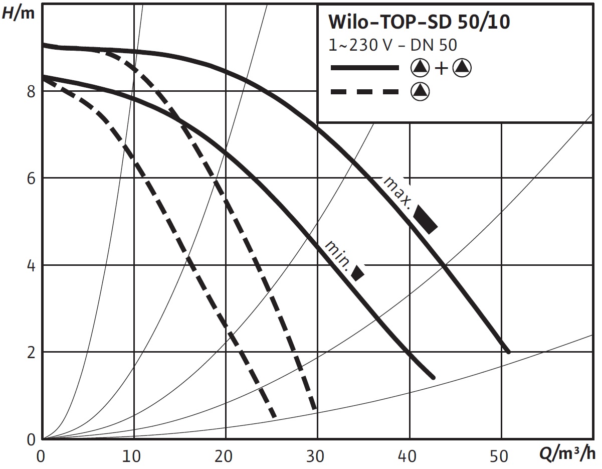 Wilo-TOP-SD - Здвоєний насос: насос з мокрим ротором - циркуляційний насос з фланцевим з'єднанням (TOP-SD 30/5 з різьбовим з'єднанням). Два електродвигуна на одній насосної частини дозволяють працювати в алгоритмі робочий – резервний, робочий-піковий, коли додаткова щабель підключається при нестачі однієї. При виході з ладу одного електродвигуна з різних причин, робота триває на другому, поки перший знаходиться на ремонті. Передбачений легкий демонтаж двигунів та заміна на нові.