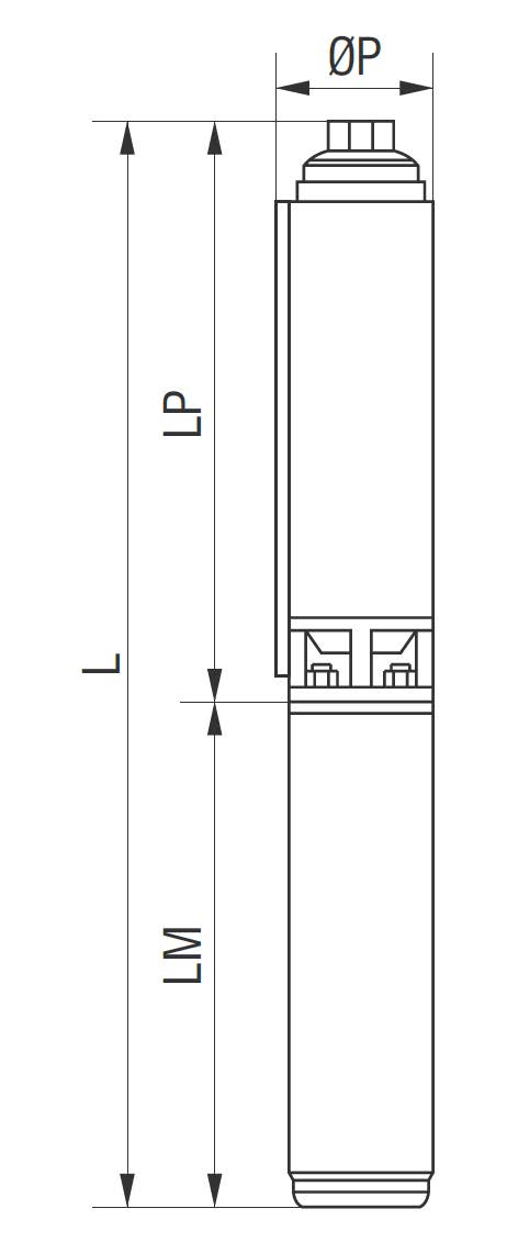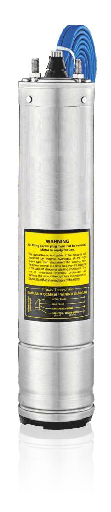 Двигун побудований у наступному виконанні: Гільза двигуна виготовлена з AISI 304, Верхня/нижня опора виготовлені з AISI 304. Двигун заповнений сумішшю води та гліколю, що гарантує охолодження та змащення блоку тяги. Компенсація тиску відбувається через гумову мембрану, розташовану знизу, і компенсаційний клапан у верхній частині. Ущільнення ел. двигуна – механічне торцеве ущільнення. Клас захисту – IP 68 Клас ізоляції - В Живлення – 3 x 380-400 V /50 Hz Вивід кабелю живленння – 3х1.5+1.5 Н07 RNF |