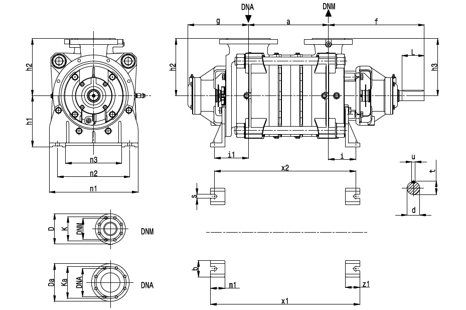 Усмоктувальна частина з аксіальним входом. Сходи складаються з корпусу, дифузора і стопорних кілець. Змінні робочі колеса. Патрубок вихідний секції – з вертикальним виходом і може бути повернутий на 90°. Висока міцність посадочного місця підшипника з боку приводу. Опора з боку всмоктування змащується перекачуваною рідиною. Вал виготовлений з нержавіючої сталі. Регульоване сальникове ущільнення на валу або механічне – регульоване, або нерегульоване, в залежності від робочого тиску рідини.