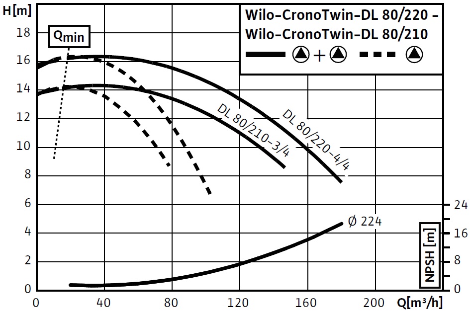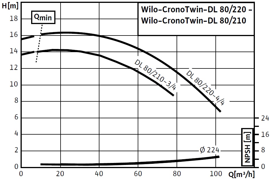 Wilo-CronoTwin-DL – Здвоєний насос з сухим ротором у виконанні Inline з фланцевим з'єднанням. Два електродвигуна на одній насосної частини дозволяють працювати в алгоритмі робочий – резервний, робочий-піковий, коли додаткова щабель підключається при нестачі однієї. При виході з ладу одного електродвигуна з різних причин, робота триває на другому, поки перший знаходиться на ремонті.