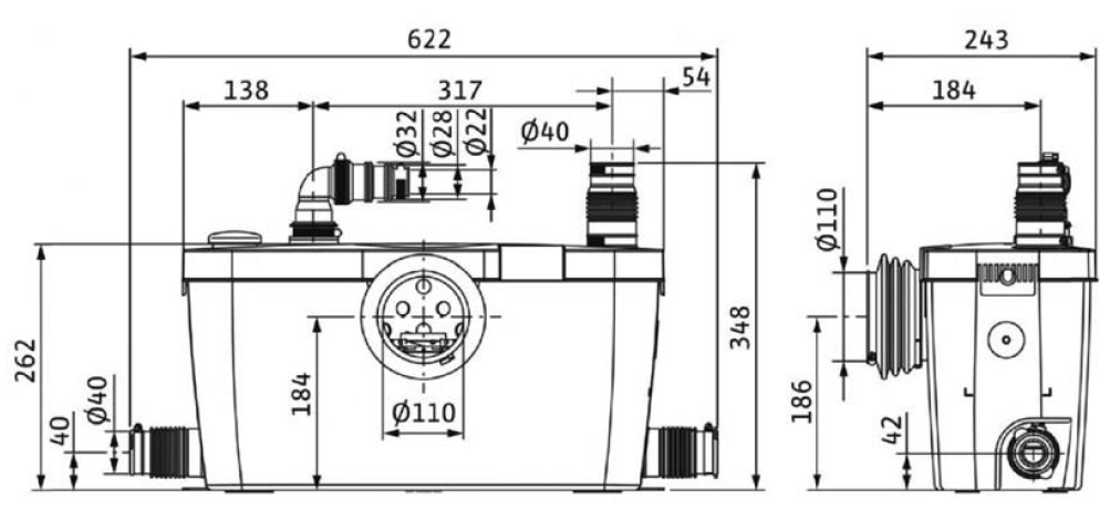 Готова до під’єднання малошумна автоматична напірна установка для відведення брудної води відповідно до EN 12050-3 з усіма необхідними перемикальними та керувальними пристроями.