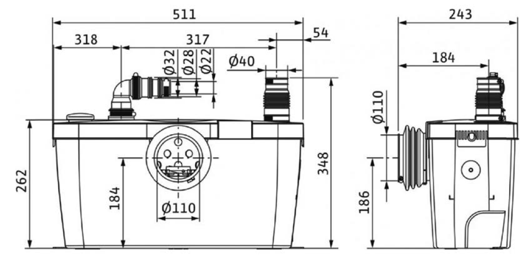 Готова до під’єднання малошумна автоматична напірна установка для відведення брудної води відповідно до EN 12050-3 з усіма необхідними перемикальними та керувальними пристроями.