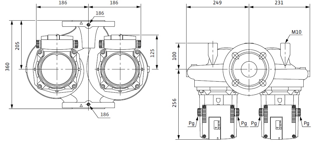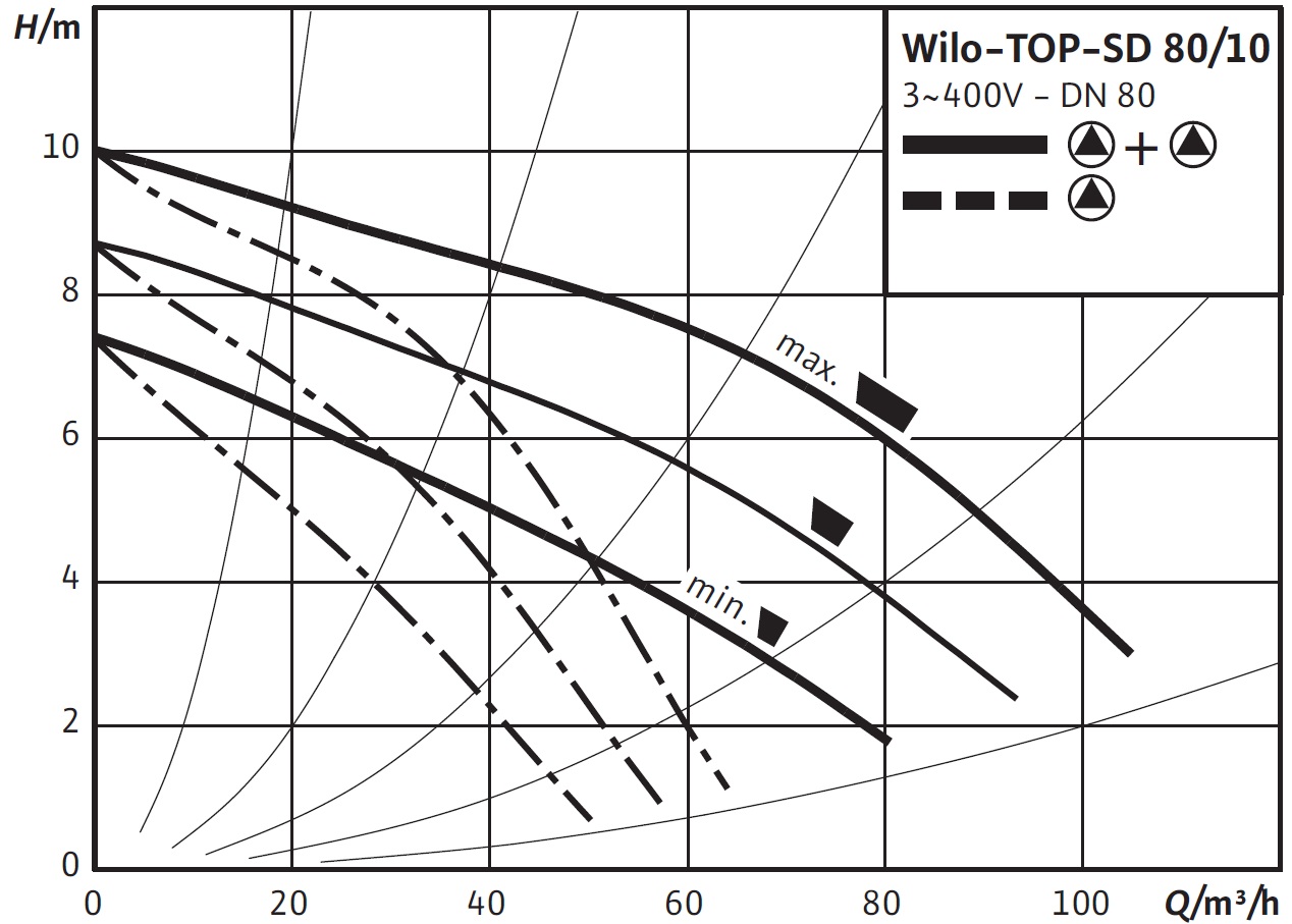 Wilo-TOP-SD - Здвоєний насос: насос з мокрим ротором - циркуляційний насос з фланцевим з'єднанням (TOP-SD 30/5 з різьбовим з'єднанням). Два електродвигуна на одній насосної частини дозволяють працювати в алгоритмі робочий – резервний, робочий-піковий, коли додаткова щабель підключається при нестачі однієї. При виході з ладу одного електродвигуна з різних причин, робота триває на другому, поки перший знаходиться на ремонті. Передбачений легкий демонтаж двигунів та заміна на нові.