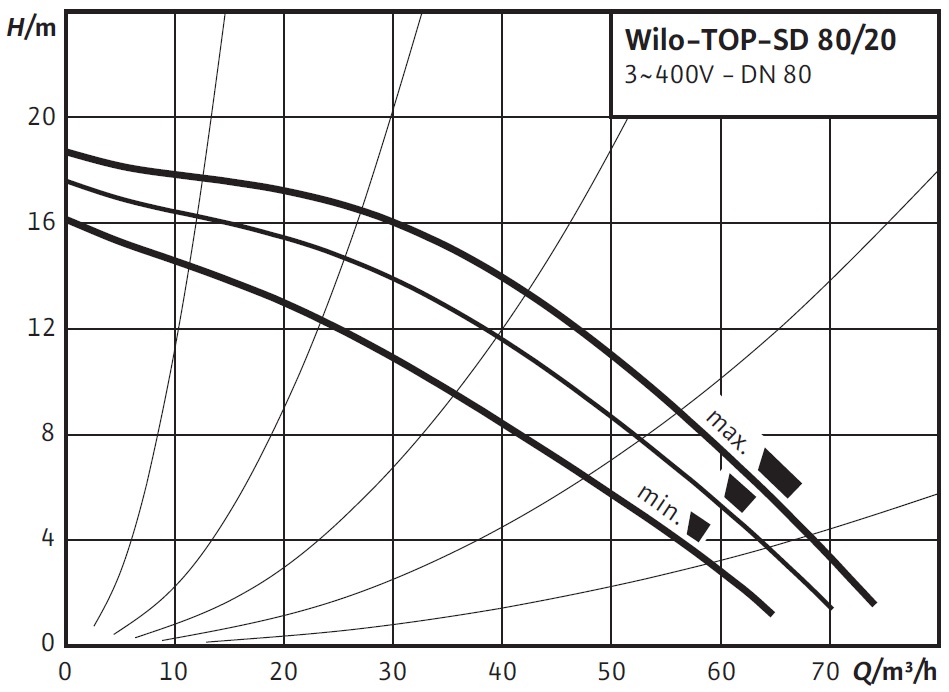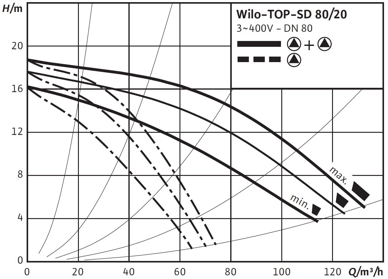 Wilo-TOP-SD - Здвоєний насос: насос з мокрим ротором - циркуляційний насос з фланцевим з'єднанням (TOP-SD 30/5 з різьбовим з'єднанням). Два електродвигуна на одній насосної частини дозволяють працювати в алгоритмі робочий – резервний, робочий-піковий, коли додаткова щабель підключається при нестачі однієї. При виході з ладу одного електродвигуна з різних причин, робота триває на другому, поки перший знаходиться на ремонті. Передбачений легкий демонтаж двигунів та заміна на нові.