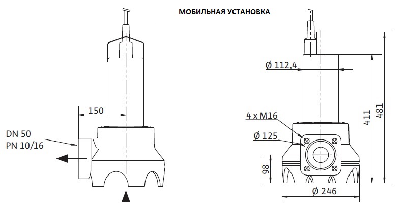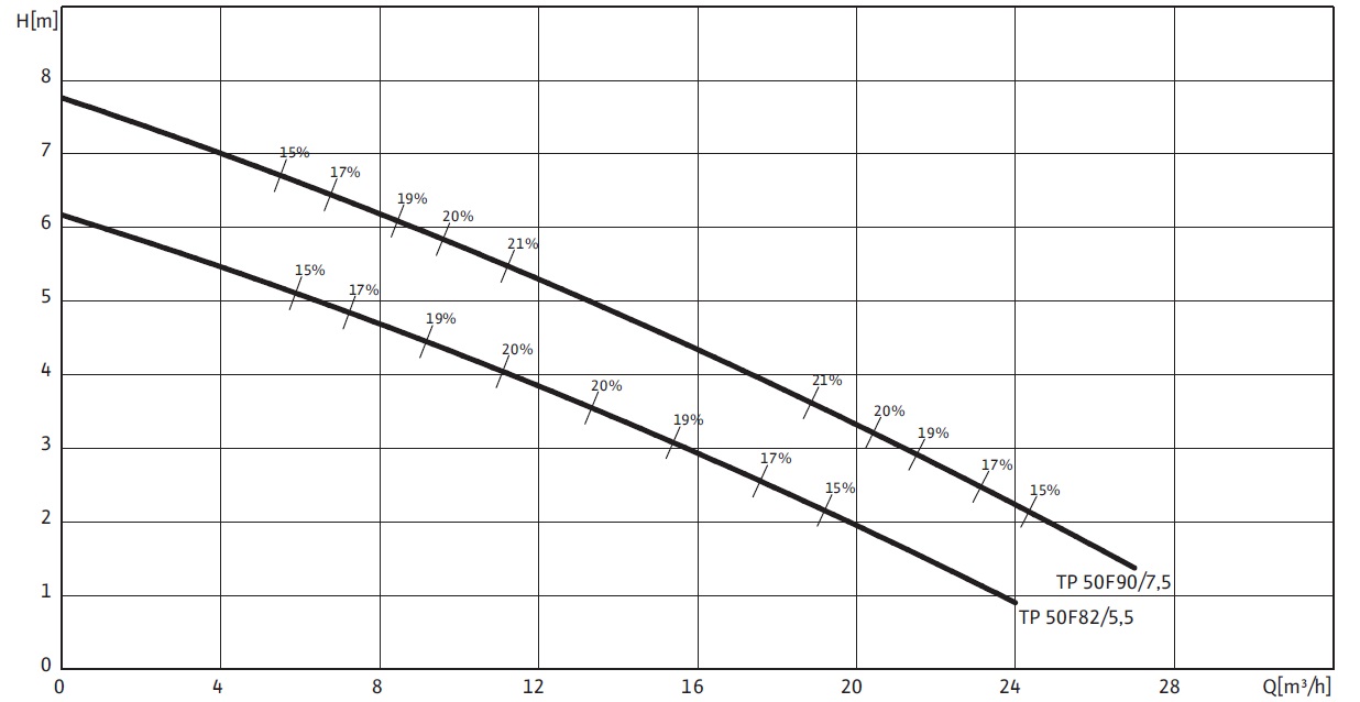 Гідравліка: Спуск з напірної сторони виконаний у вигляді горизонтального фланцевого з'єднання DN 50 або DN 65. В якості форм робочого колеса застосовуються одноканальне (E) або вільнопротічне робоче колесо (F).