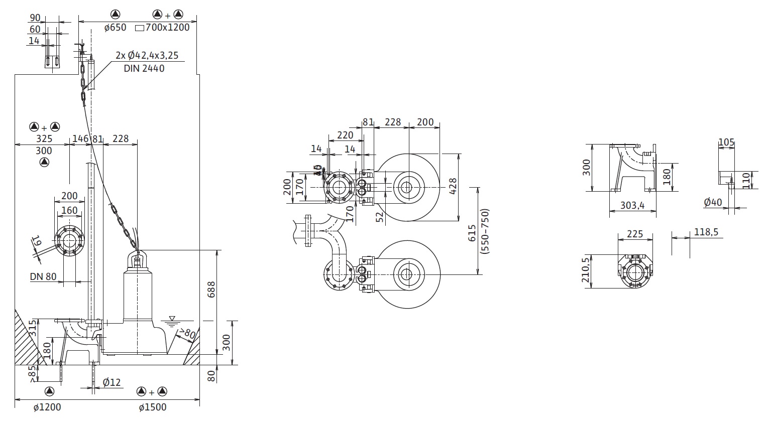 Гідравліка:  Горизонтальний напірний патрубок для фланцевого під'єднання DN 80 DN 100. Застосовується робоче колесо одноканальне.