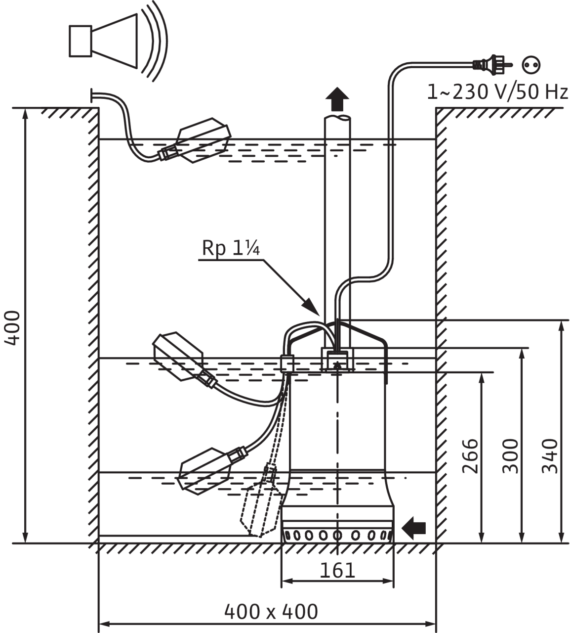Занурювальний насос для стаціонарного та мобільного установки в зануреному стані для повністю автоматичного режиму завдяки встановленому поплавковому вимикача.